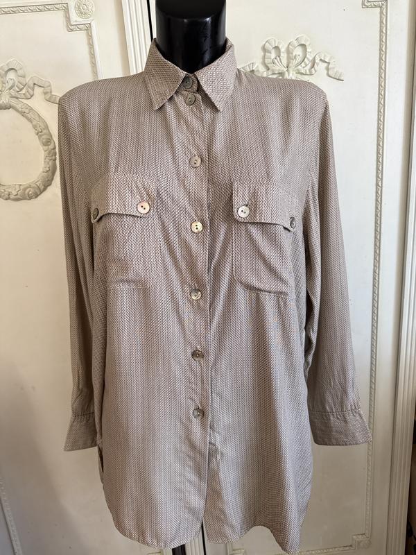 Вінтажна блуза з віскози(100/). Цікавий визерунокв бежево-коричневосу тоні. Застібка-перламутрові ґудзики, по боках-розрізи. Розмір по бірці-40. Заміри: довжина-77 см, ПОГ -54 см, ПОБ-55 см, рукав-60 см. Стан ідеальний.