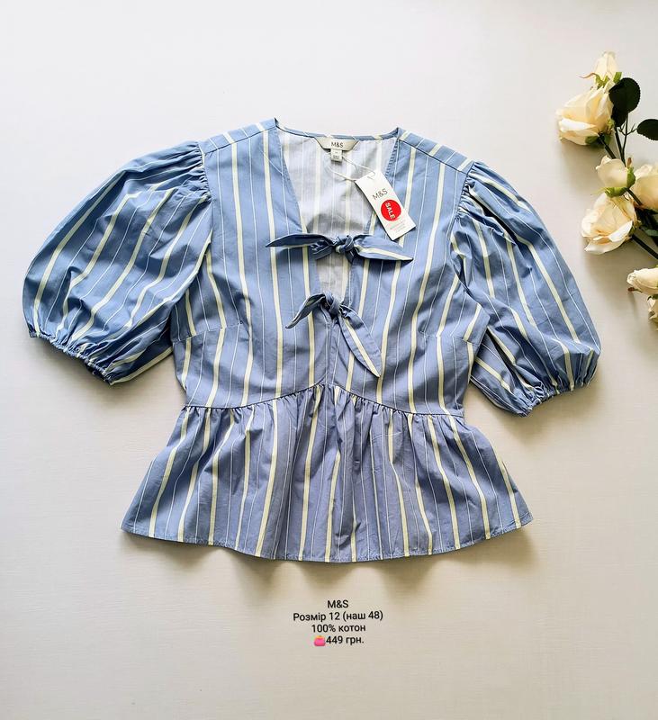 Блуза от M&S. Размер 12 (наш 48). Состав: 100% коттон. Замеры: длина по спинке 58 см, ПОГ 49 см, ПОТ 39 см резинка тянется до 45 см, ПОБ 64 см, плечо 11 см, длина рукава 36 см. Состояние новое с бирками.