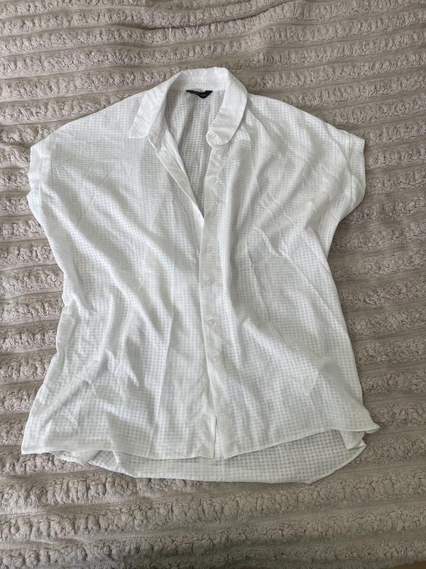 біла жіноча сорочка з коротким рукавом, яка має кілька характерних особливостей дизайну та крою: Основні характеристики Матеріал та текстура: Сорочка має напівпрозору тканину з дрібним картатим візерунком (check pattern).Текстура нагадує легку бавовну, муслін або суміш з льоном, що характерно для літнього одягу. Фасон: Вільний крій (relaxed або boxy fit) із приспущеною лінією плеча. Така модель не обмежує рухів і забезпечує гарну вентиляцію в спеку