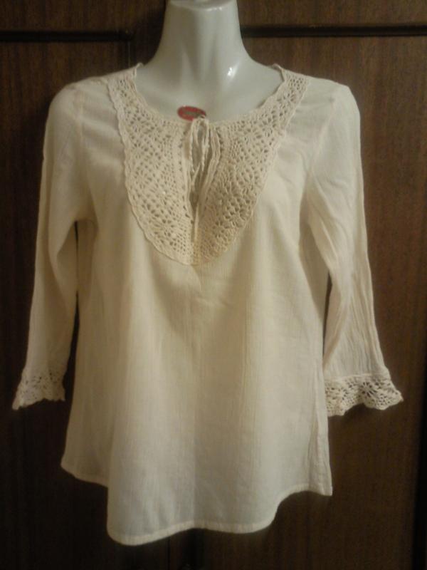 Блуза с вязаной ажурной вставкой,приятная к телу,в хорошем состоянии.