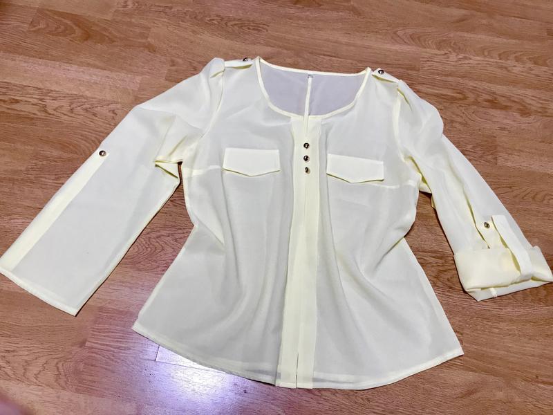 Легкая шифоновая блузка, нежно лимонного пастельного цвета (фото не передало цвет, в реале намного красивее). Новая, не разу не одета! Размер на L-XL. Рукав подкачивается в три четверти. Пуговки золотого цвета. Ширина плеч изделия 36 см, длина изделия 62 см, полуобхват талии 51см, длина откоченного рукава 59см
