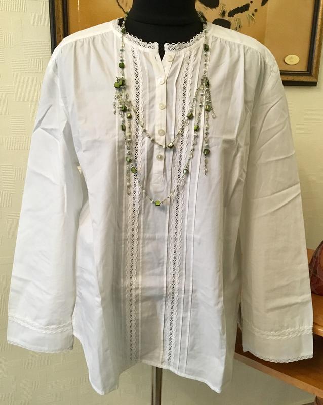 Оригинальная блузочка белого цвета, в стиле деревенский шик . Красивый вырез, обработанный кружевом, придает блузке женственность и стильность, ровный крой делает блузку модной Эта шикарная блузка создана именно для Вас! Блуза выполнена в классическом варианте , она прекрасно подойдет для создания разнообразных стильных образов как с юбками, так и брюками. Эта блузка по настоящему великолепна! Laura Ashley в новом состоянии подойдёт от 46-до 52 размера.