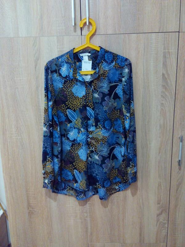 Интересная блузка, свободный крой, впереди застежка под горло, спинка удлиненная, на 8 см ниже переда, ткань не просвечивается. Длина 74 см, пог 49 см, рукав от плеча 61 см, манжет рассчитан на тонкое запястье. Хорошо подойдет как под джинсы так и под классические брючки или деловую юбочку.