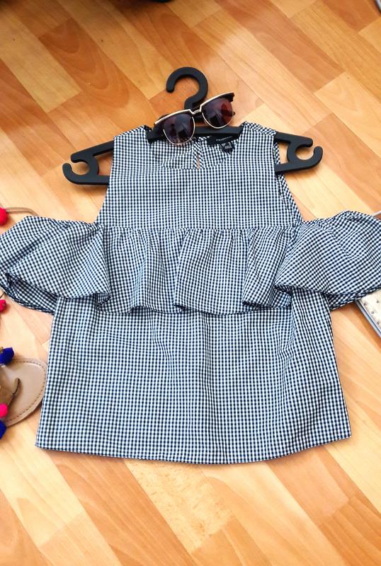 Красивий котоновий топ з воланом і відкритими плечиками, розмір С-М(10). Довжина 53 см, ПОГ 46 см, не тягнеться.