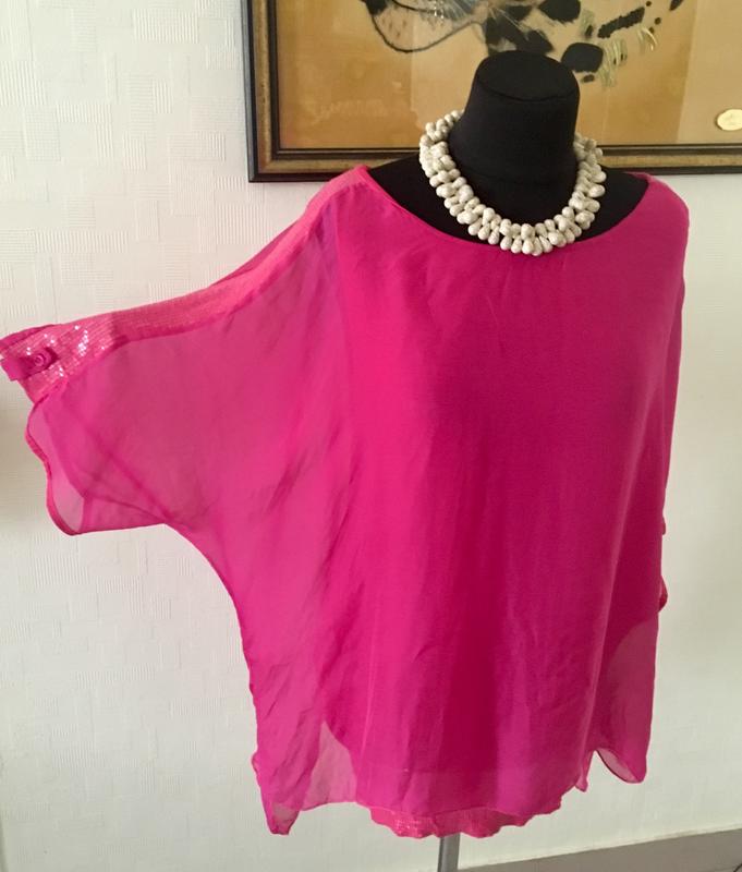 Шикарная шелковая туника oversize размера , внизу трикотажная майка, на нижней резинке украшена пайетками . Шёлк 100%.