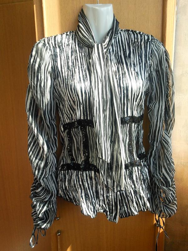 Оригинальная блуза с бантом,интересный шифоновый рукав,основная ткань сжатая,украшена паетками.