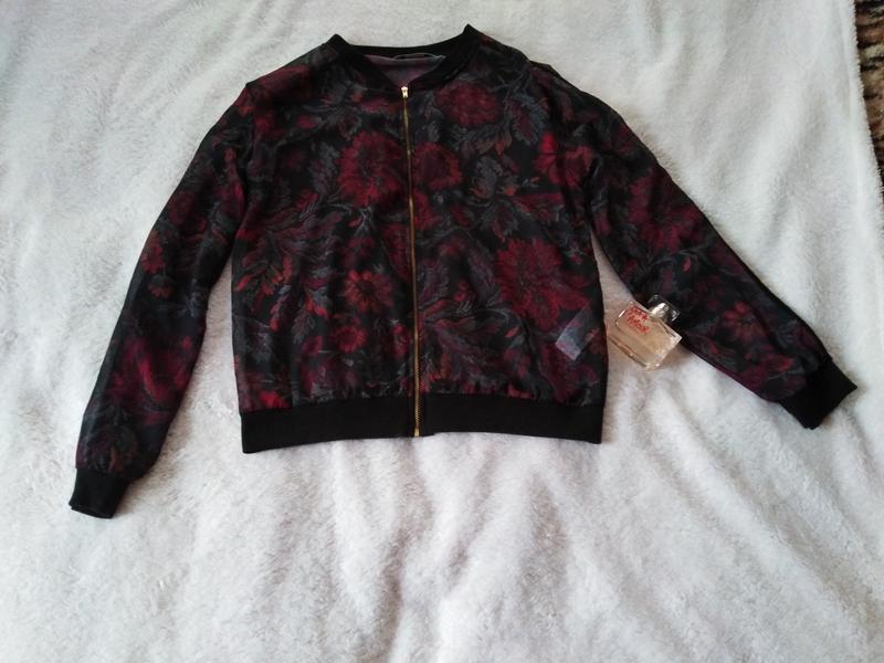 Дуже модна блуза чорного кольору, в принт квіти, зроблена під бомбер, на замочку. Напівпрозора.