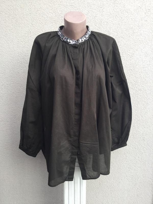 Легкая блуза-реглан,стразы по вороту,рубаха бохо,этно стиль,хаки,большой размер