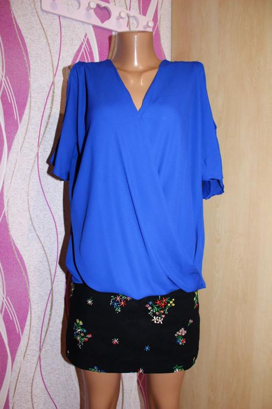 Нова, проте паперові бірки не збереглися. Без нюансів. Виглядає дуже гарно, стильно та сучасно. Рукав пошитий вільним воланом. Спинка іде довшою за перед. ПО (у вільному та максимально розтягнутому стані):грудей 60-63 см, талії 57-60 см, стегон 60-62 см, довжина (перед/зад) 59/68 см, рукав (від горловини) 39 см.