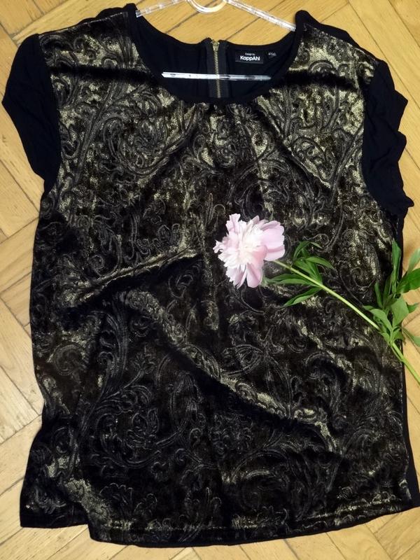 Стильная , нарядная . Змеечка на спинке . Зад и рукавчики черный трикотаж . Перед нарядная ткань с узорами темного золота (не люрекс ) Очень красивая. Размер 48- 50 наш