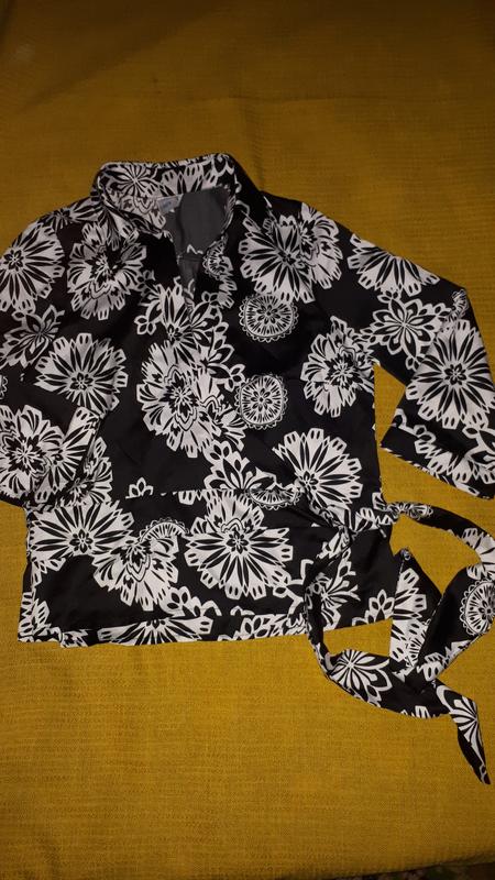 Блуза на запахе,цвет черно-белый, абстракция. Приятная мягкая ткань как шелк. Смотрится стильно нарядн о и симпатично. Внутри завязка,см. фото . Впереди встрочен пояс и тож е завязывается.Воротничок.Рукав 3/4.Спинка,см.фото 8, вверху на кокетке и без пояса. Длина 56см,пле чи 35см,грудь 45-46см,низ 44см, рукав 44см. Аккуратные швы. Если надо еще фото - дошлю.