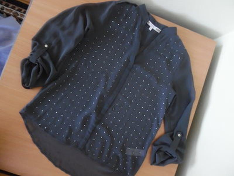 Блуза Некст шифон с камнями рукав можно ровный а можно 3-4 носить. Без дефектов размер стоит 14, но чуть маломерит на 12 будет.