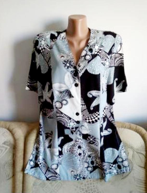 Прекрасная блуза с коротким рукавом, на пуговицах, с разрезами по бокам. Ткань приятная на ощупь. Фирменная этикетка срезана, поэтому бренд определить не удается. Пог 60 Поб 60 Длина 80 Бицепс 21