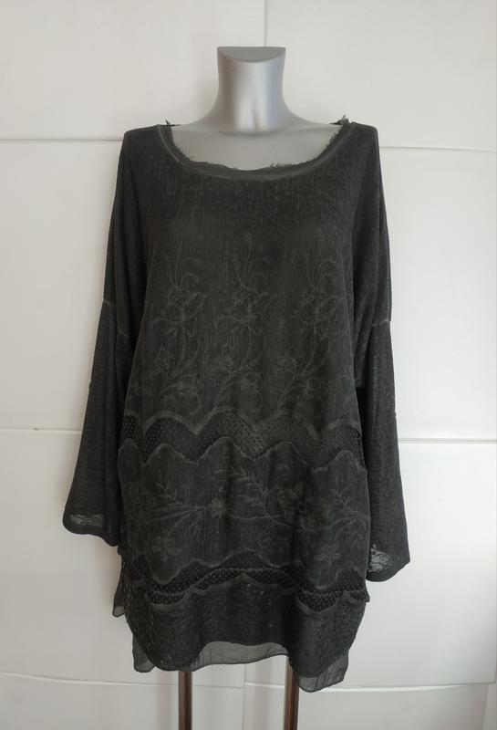 Блуза, кофточка вільного крою оверсайз з асиметричним низом і вставками з мережива. Виконаний з якісного натурального матеріалу льон з бавовною. 🔥Стан нової речі без дефектів! 🔥На бірці розмір не вказаний. Підійде на наш 54-56-58 🔥Заміри довжина 75/92, плечі 88, рукави 68 від горловини, пог 75, пот 75.