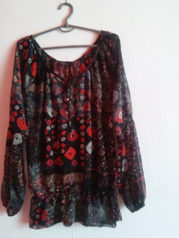 Очень легкая красивая туника блуза.Состав срезан.Но ткань шифон. длина-68 см пог..пот..поб-55\57 см длина рукава от горловины-72 см