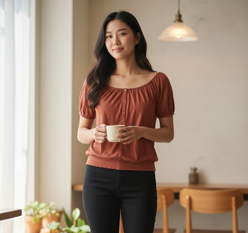 Легкая натуральная блуза цвет тарракота.Пог 54.Длина 54. Резинка сверху резинка снизу рукав на резинке.