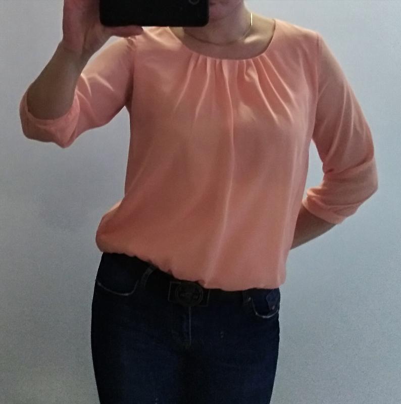 Блуза из шифона внизу на резинке. Красивый персиковый цвет. Состояние новой вещи. Без бирки. ОГ 48 см, ОТ 50 см, плечи 38 см, длина 60 см, рукав 45 см.