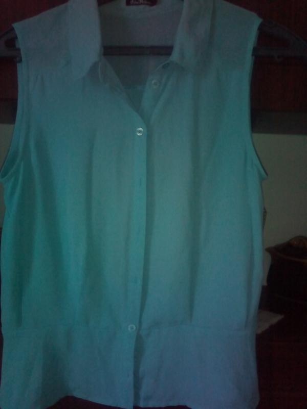 легкая блузка бирюзового цвета, снизу ложится как баска,ткань похожа на шифон.