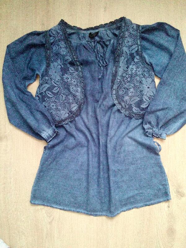 Блуза з желеткою в комплекті, можна носити і окремо. Желетка кружевна. Фасон вільного (широкого) крою,підійде на р-р С, М, Л. Можна носити з тонким поясочком.