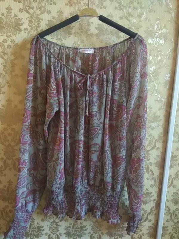 Красивая блузка, впереди на завязке, низ и рукава на резинке. Длина 65, пог 53, рукав 65.