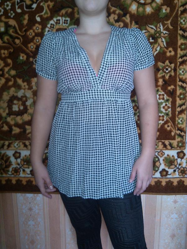 Блуза с V-образным вырезом,короткими рукавами немного фонариком (на рукавчике пуговица обтянутую тем же шелком).По спинке складочки,от груди блуза расклешенная,что позволит скрыть недостатки фигуры если таковы есть.Размер указан 10,замеры плечи 33,5 см, ПОГ 40 см,ПОТ 36 см, длина 66 см.