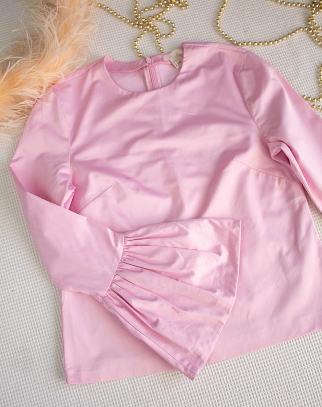 Блуза H&M з рукавами воланами. Тканина дуже гарно переливається, як сатин. Стан ідеальний. Розмір ХС (6) Заміри: Груди ПО 44см талія ПО 44см рукав 62см довжина по спинці 53,5см