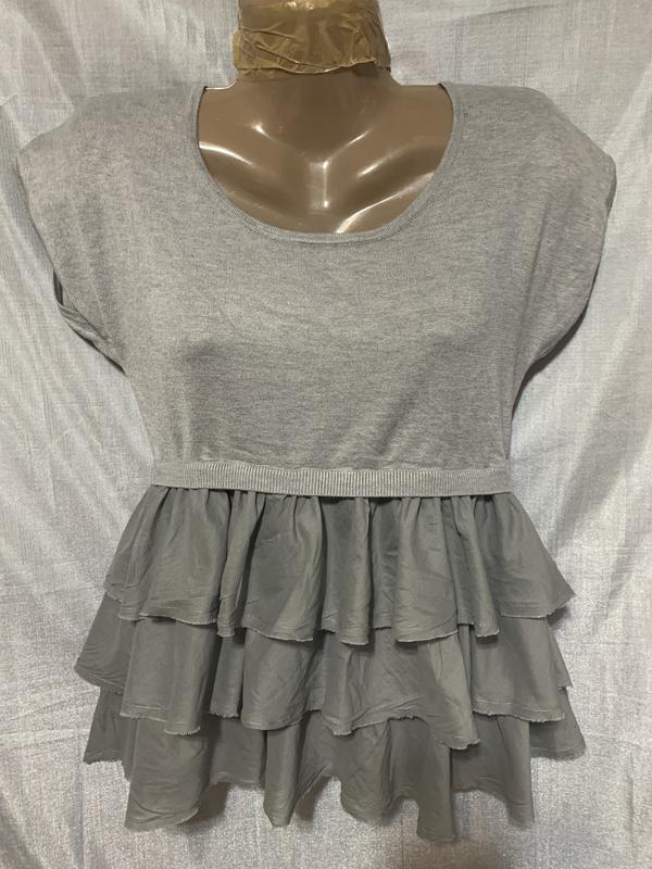 Трикотажна кофта з рюшами з бавовняної тканини. Заміри: довжина - 61см., обвислі плечі - 52см., ПОГ - 45см., ПІТ - 37см.,ПОБІДИ - 49см