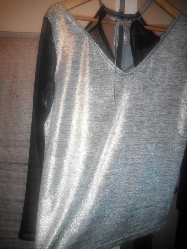 Нарядная кофточка золотистого цвета с черной сеткой прямого силуэта, интересно оформлена горловина.ПОГ 52,ширина по низу 52,длина 62,длина рукава 57,5