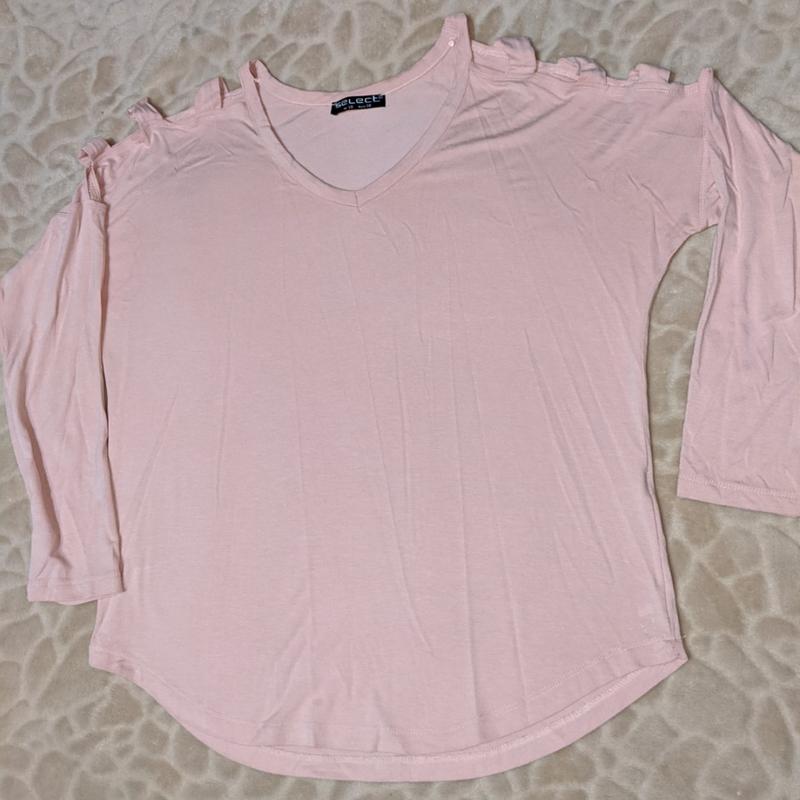 пудровая блуза, с открытыми плечиками, V образным декольте, сзади немного длинее, в отличном состоянии Длина 55см, сзади 65 ширина 50 размер 10/38