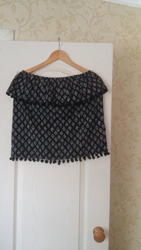 Блуза 10 размера, черная с белым узором, Индия. Без бретелек, на резинке, держится на груди. Верхний волан и низ украшены помпонами. Замеры: Длина 49 см ПОГ 51 см ПОТ 51 см Ширина волана 15 см