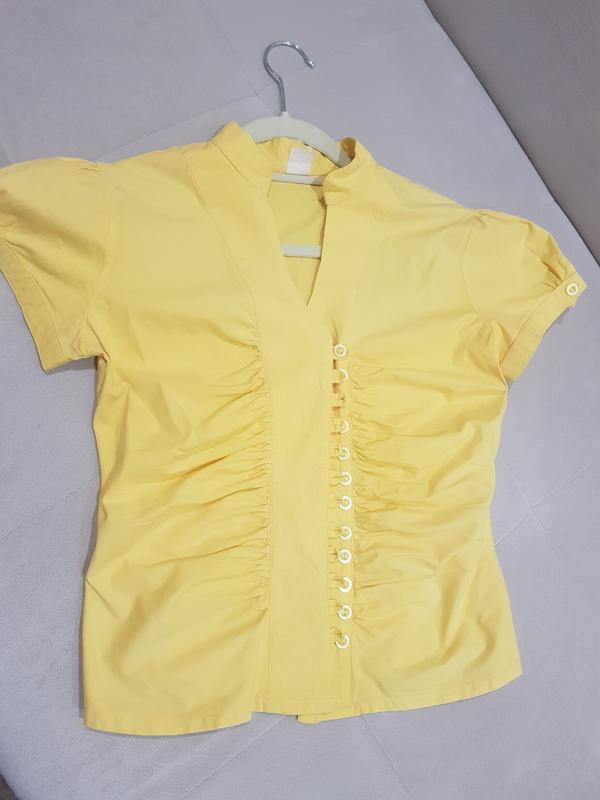 Гарна блузка жовтого кольору. Розмір десь 46 укр. Ґудзики треба застьобувати. Продаю, бо чищу шафу. Висота по спині 51,5 см, ПОГ 45 см, ПОТ 40 см. Матеріал тягнеться.
