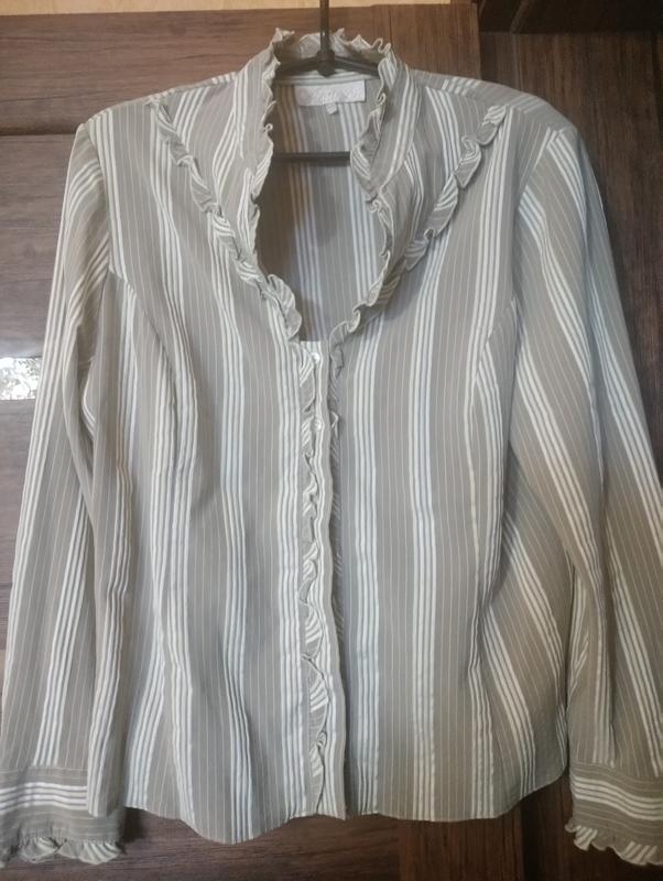 Блузка на пуговицах с красивыми воланами, ткань тянется, вискоза+полиэстер, очень приятная к телу. Размер указан 48, на наш 50-52. Без нюансов, состояние идеальное.