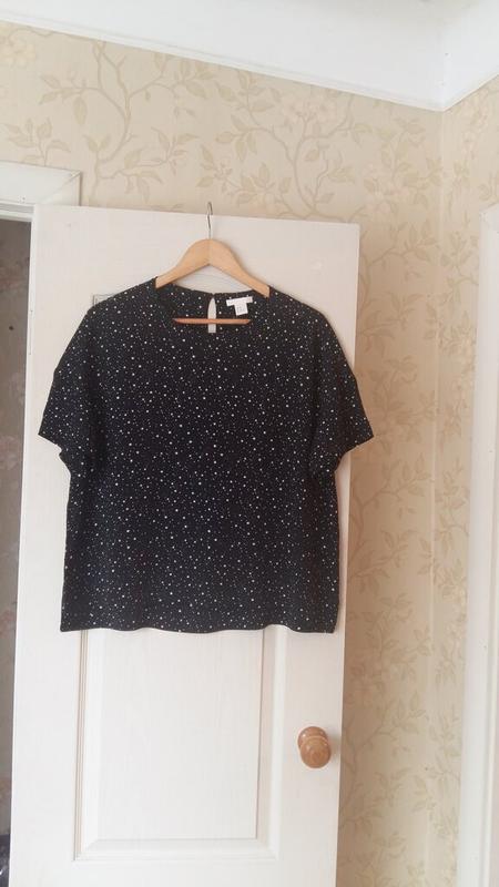 Блуза "темная ночь" свободного кроя, цвет черный в мелкие белые звездочки. На бирке размер 40 европейский, но большемерит, нужно ориентироваться по замерам. Спущенный рукав, по бокам небольшие разрезы. Произведено во Вьетнаме. Замеры: Длина 62 см ПОГ 56 см ПОТ 59 см ПОБ 64 см Длина рукава от горловины 35 см