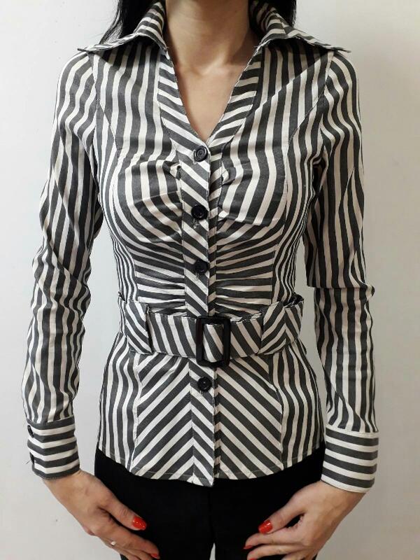 Дуже стильна блуза - сорочка в смужку на гудзиках з поясом. Довгий рукав. Смужка прикрашена блискітками. Блуза колір молочний. Стан ідеальний. Добре тягнеться. ПОГ-38 см ПОТ-35 см Довжина рукава -58 см Довжина по спинці від плеча -57 см Плечі -38 див.