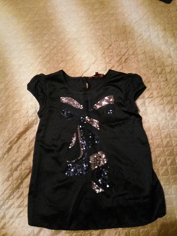 блуза темно-синього кольору, перед атлас з малюнком в паєтки, зад блузи хб. легка та зручна.
