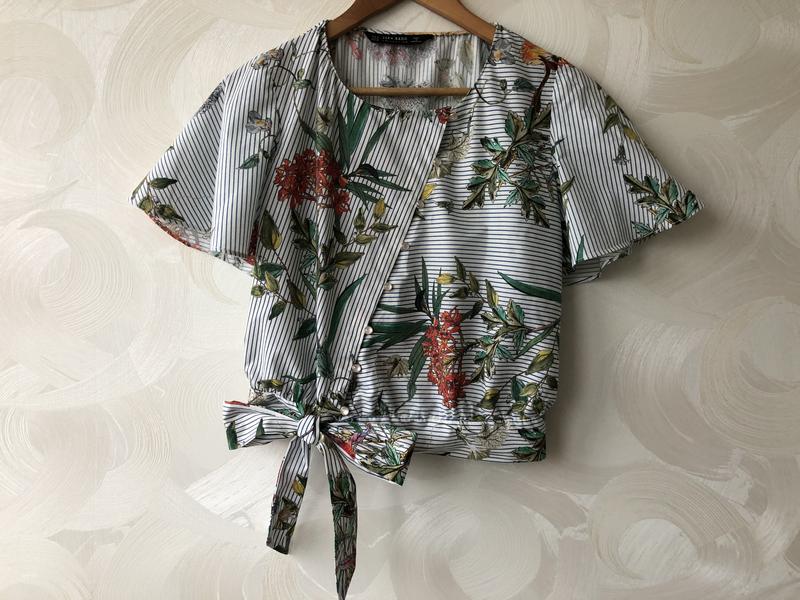 Цветочная коротенькая блузочка . Застегивается на пуговки. На талии 🎀😊. Состояние идеальное . Размер М . Длина 50 см Пог 49 см Пояс 38 см