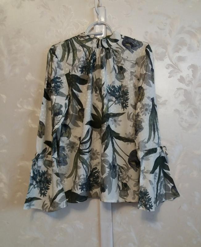 Красивейшая цветочная блуза с воланами на рукавах. Длина 66, ПОГ 52, ПОТ 52, ПОБ 55, ширина плеч 39, длина рукава 62
