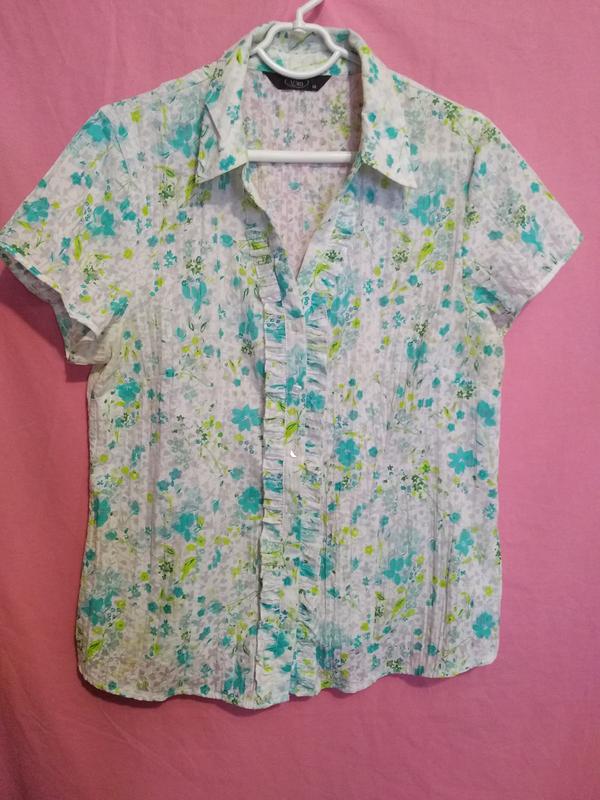 блузка с небольшими рюшами,короткий рукав,с просвещающимся узором в цветочный принт.Размер 14