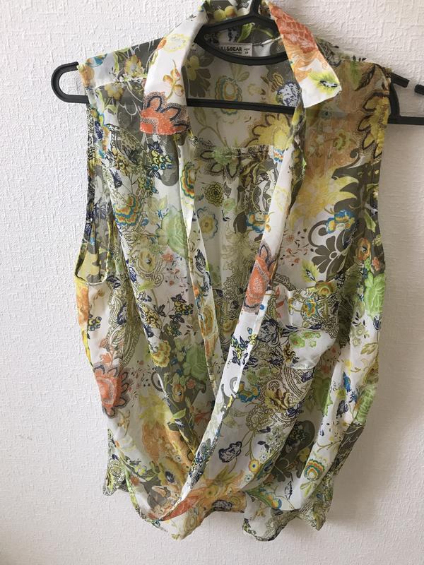 Летняя блуза на запах, размер м, но больше на л. Покупала в Дубаи на распродаже, не носила. Новая. Ткань прозрачная. грудь 110 см, за счёт запаха свободная, длина 55/68 см