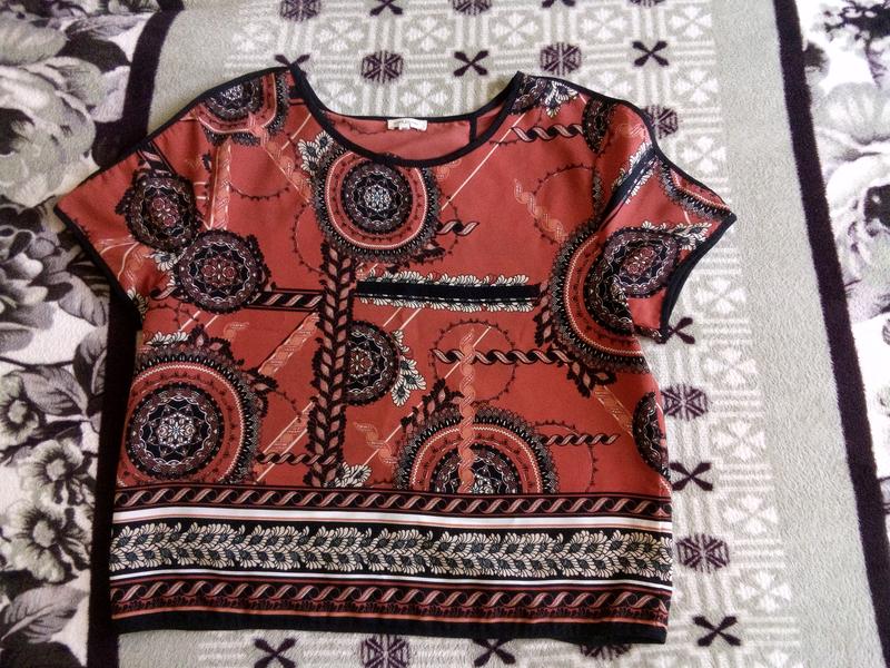 Стильная блуза с платочным принтом от River Island, сзади на глубоком запахе, свободный крой. Ткань тонкая, легкая, не прозрачная, не тянется в идеальном состоянии. Размер 42-44. Замеры ПО груди 50 см., длинна блузы 55 см.