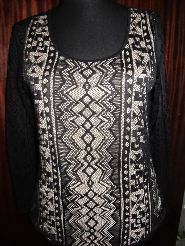 Блуза интересного дизайна. Рукава кружевные, спереди подклад телесного цвета.