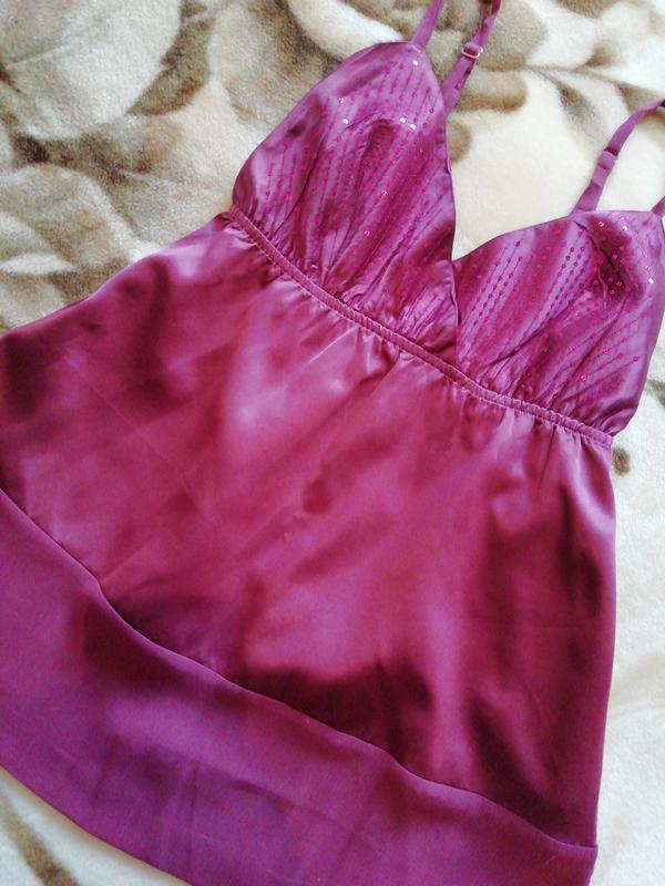 Стильний атласний топ вільного крою. На грудях паєтки (без чашки), шлейки регулюються, низом пришитий манжет в колір (шифон) , який видовжує виріб. Об'єм грудей підкреслює вшита резинка. Зручно носити і вагітним, і жінкам, які скривають "животики".