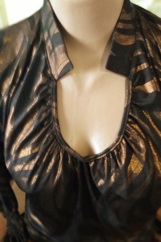 трикотажна блуза р.48 -колір чорний/бронза, малюнок хвиляста абстракція -матеріал віскоза 60%, поліестер 30%, , спандекс 10% -комір "стійка", горловина оброблена еластичним кантом, що дозволяє регулювати об'єм декольте. -рукав реглан/ "летюча миша" з еластичним драпіруванням на зав'язках, що дозволяє регулювати довжину рукава -низ з боків блузи також зібраний в драпірування на таких же завязках -довжина 60см, ПОТ 38см, ПОГ 48см