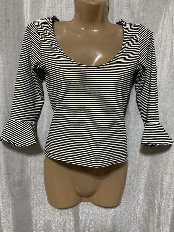 Кофточка трикотажная, с круглим вырезом горловины и воланчикаии на рукавах. Замеры: длина - 46см., плечи - 32см., рукав - 40см., ПОГ - 36см., ПОТ - 35см ПОБ - 35см