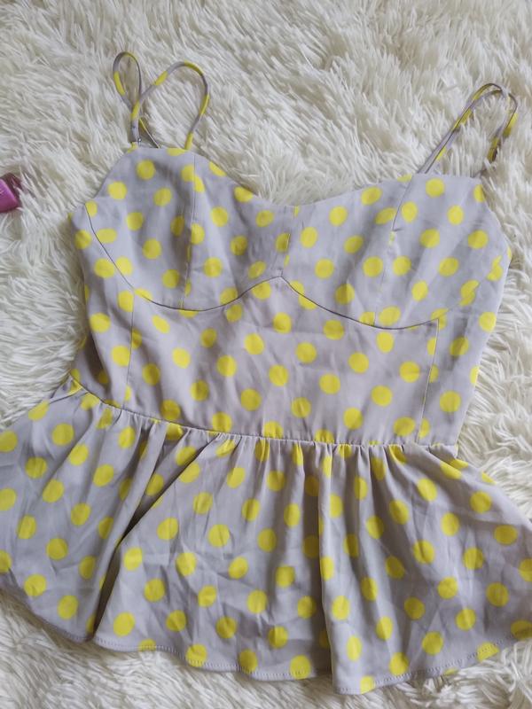 мегаяркий топ, красивые рюши, лимонно желтого цвета горошки