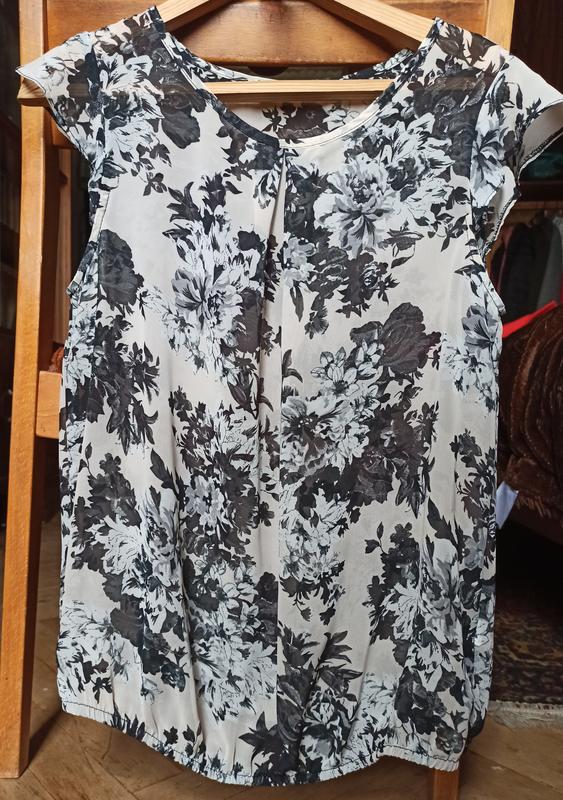 Блузка черно-белая с цветочным принтом, воздушная, как раз на лето, с легкой резиночкой на талии. Материал - шифон, размер - 40, б/у, дефектов нет. На все вопросы с радостью отвечу!)