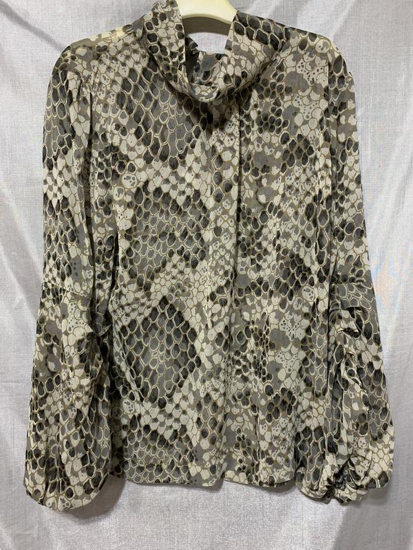 Нарядная блузка с воротником-стойкой, застежка сзади на пуговицу и оригинальными рукавами. Замеры: длина - 66см, плечи - 40 см, рукав - 60 см, ПОГ - 53 см, ПОТ - 50см, ПОБ - 55см