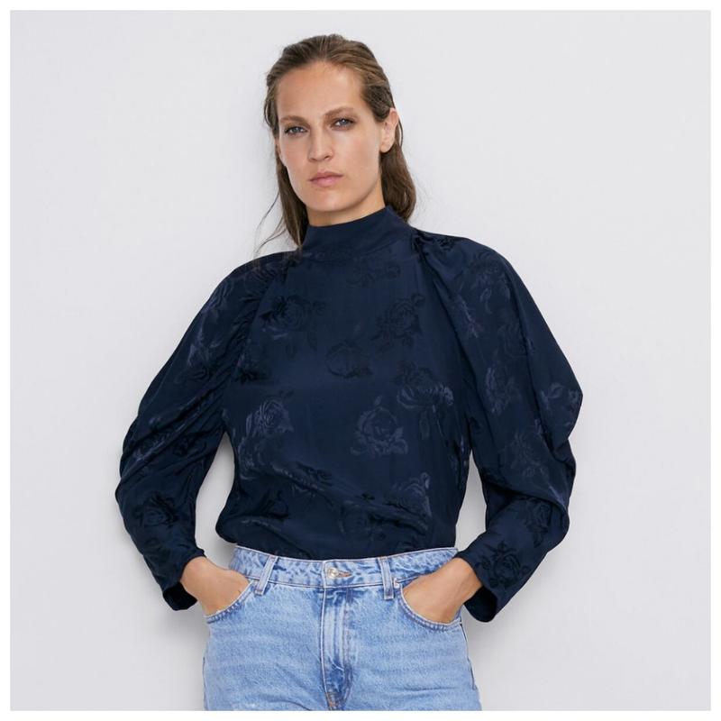 Zara оригинал. Новая коллекция с бирками Размер : М , за счет фасона подойдет на S/M Одето на S/M 90-65-95 рост 165 Тканная жаккардовая блуза с набивным атласным рисунком Розы . Высокий ворот-стойка , застежка сзади на 2 золотистые пуговицы . Длинный реглан-рукав ,интересный крой объемного плеча создает эффект фонарика .Красивый темно-синий цвет. Приятных Вам покупок :) Смотрите весь наш магазин -много интересных брендовых вещей высокого качества !