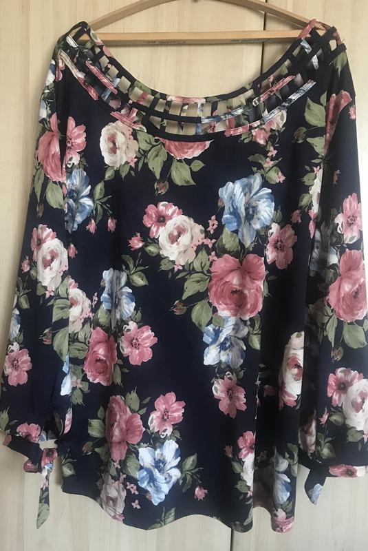 Новая блуза роскошной расцветки. Новая, куплена в Америке. Рукав три четверти. Полиэстер . Красивая отделка горловины. На спинке V- образный вырез на завязке, рукава тоже на завязке. Замеры: полуобьем груди 54 см. Длина блузы 60-61 см. Длина рукава 49 см. Цветовая гамма немного искажена на фото.
