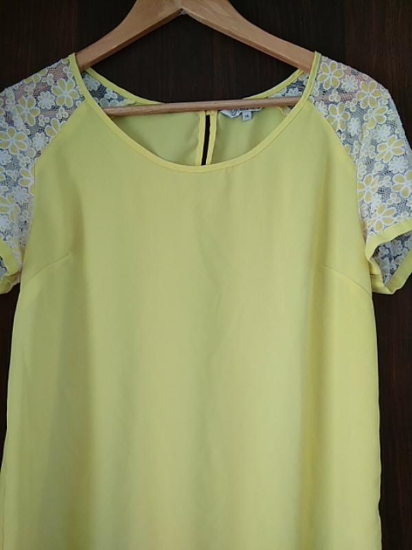 Блузка жовтого кольору з красивим декором на рукавах.
